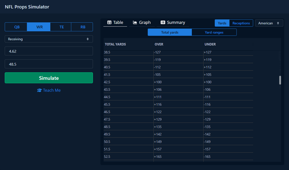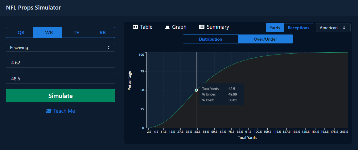 Toggle over to the “Graph” section and use the “Over/Under” option to look at any line along the distribution curve and see where the price should be. You can also quickly spot where the median would be for a coinflip prop based on your inputs. Here, we can see it’s about 42.5 yards on Diggs at our reception and yardage numbers.