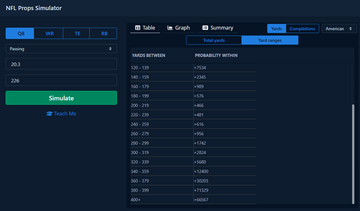 Pros like these props as many will run simulations very similar to the Unabated Props Simulator to figure out odds for each possibility in the distribution. For example, you might wildly guess that the odds for Maye to throw for 300-319 yards should be +2500. You see odds of +2200 and take a nibble. A pro, on the other hand, after running their simulator, might tell you the true number is +2824, and rightfully pass on the prop bet.