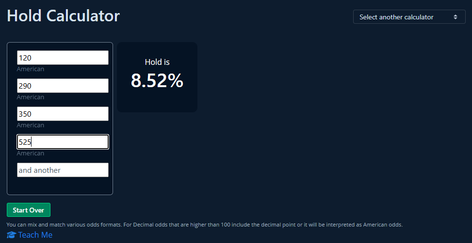 But before you go to that trouble, you might want to check the hold in this market using our Hold Calculator to see the 8.52 percent house edge makes this a tough nut to crack unless there’s a wild misprice on any one of those lines.