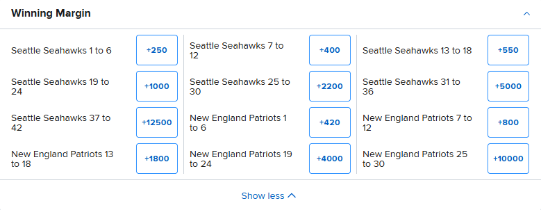 Here’s what we mean. Margin of victory is a fairly common game prop. Will the Patriots win by 1-6 points? Will the Seahawks win by 7-12?