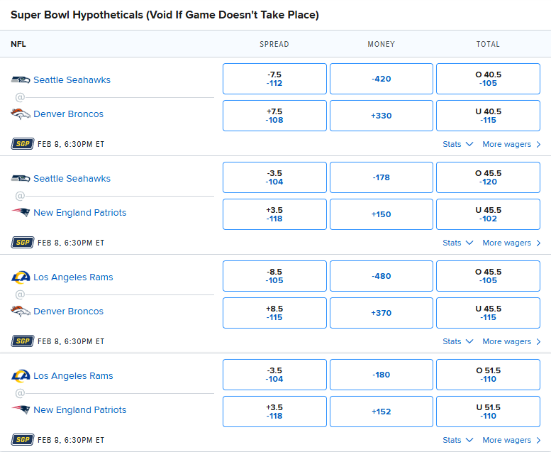 A lot has changed since then. The Hilton became LVH then became Westgate. The Superbook moniker lives on. A few years ago when Cantor Gaming had their moment in the sun they would often release by Wednesday. In more recent years, William Hill/Caesars has been bold enough to release props before Superbook. You can expect a full array of props (including harder to price cross-sport and novelty props) to come out starting Wednesday, Jan. 28.